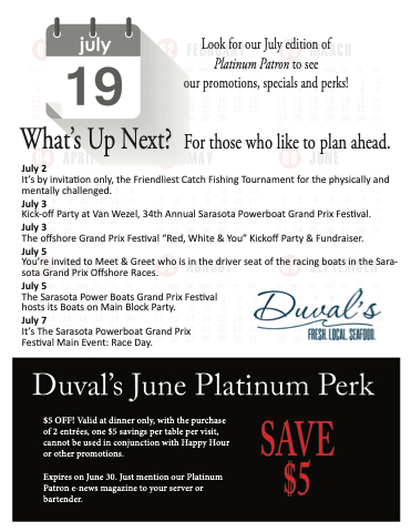 Expires on June 30. Just mention our Platinum Patron e-news magazine to your server or bartender.