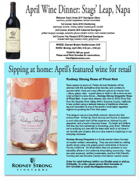 – place, grape, style. A great place to start is with a wine we fea- tured at March’s wine dinner – Rodney Strong Vineyards’ Rose of Pinot Noir. A new wine release, this wine is 100% Pinot Noir from the Russian River Valley AVA in Sonoma County, California. It was crafted using a delicate balance of traditional winemak- ing and innovation in one of the world’s most highly regarded regions for growing the Pinot Noir grape.