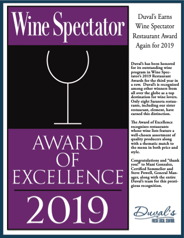 Duval’s has been honored for its outstanding wine program in Wine Spec- tator’s 2019 Restaurant Awards for the third year in a row. Duval’s is recognized among other winners from all over the globe as a top destination for wine lovers. Only eight Sarasota restau- rants, including our sister restaurant, element, have earned this distinction.