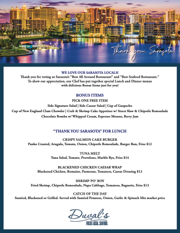 Thank you for voting us Sarasota’s “Best All Around Restaurant” and “Best Seafood Restaurant.” To show our appreciation, our Chef has put together special Lunch and Dinner menus with delicious Bonus Items just for you!