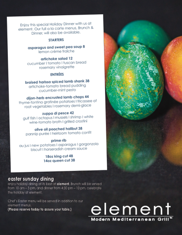 enjoy holiday dining at its best at element. Brunch will be served from 10 am – 3 pm, and dinner from 4:30 pm – 10 pm. celebrate the holiday at element.