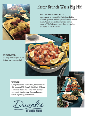 Congratulations, Herbert W., the winner of this month’s $50 Duval’s Gift Card. Walter’s name was chosen randomly from our cur- rent email list of several thousand names, which is growing every month.
