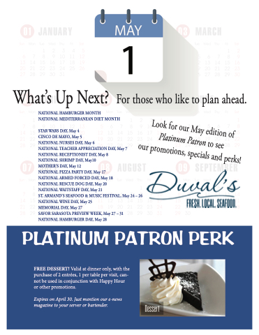 FREE DESSERT! Valid at dinner only, with the purchase of 2 entrées, 1 per table per visit, can- not be used in conjunction with Happy Hour or other promotions.