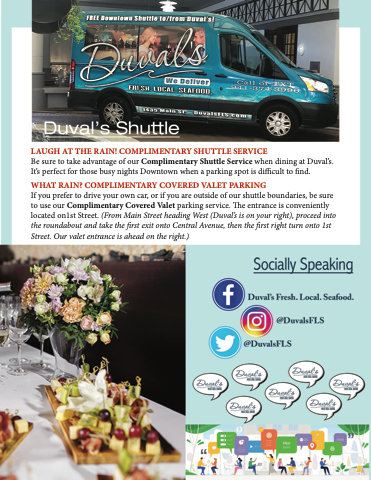 Be sure to take advantage of our Complimentary Shuttle Service when dining at Duval’s. It’s perfect for those busy nights Downtown when a parking spot is difficult to find.