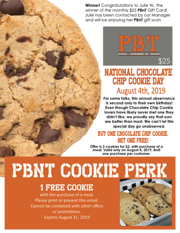 Winner! Congratulations to Julie W., the winner of the monthly $25 PBnT Gift Card! Julie has been contacted by our Manager and will be enjoying her PBnT gift soon.