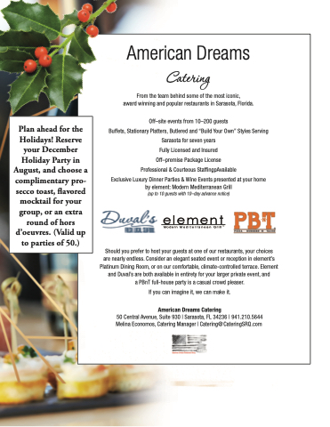 50 Central Avenue, Suite 930 | Sarasota, FL 34236 | 941.210.5644 Melina Economos, Catering Manager | Catering@ CateringSRQ.com