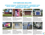OUR SERVICES INCLUDE: INTERIOR SIGNAGE SIGNAGE • • • • EXTERIOR SIGNAGE SIGNAGE • • • • MONUMENT SIGNS SIGNS SIGNS RETAIL SIGNS SIGNS SIGNS • • • • CHANNEL LETTERS • • • • STREET SIGNS SIGNS SIGNS FOR SUBDIVISIONS AND MORE! 13