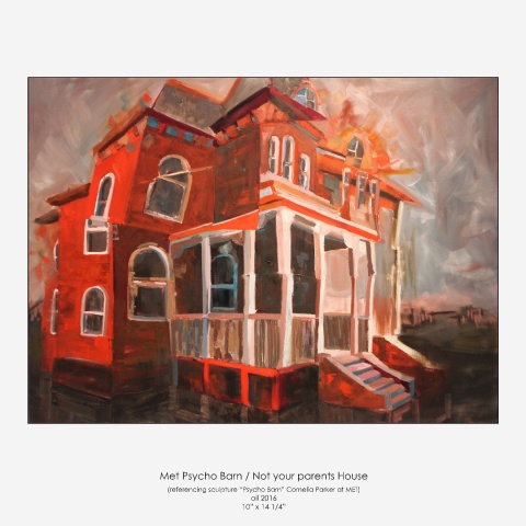 Met Psycho Barn / Not your parents House (referencing sculpture “Psycho Barn” Cornelia Parker at MET) oil 2016 10” x 14 1/4”