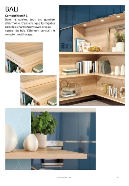 BALI Composition # 1 Dans la cuisine, tout est question d’harmonie. C’est ainsi que les façades colorées s’harmonisent avec brio au naturel du bois. L’élément central : le comptoir multi-usage. cuisine-clic.com 20