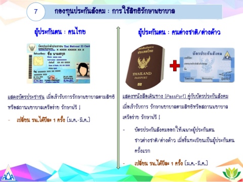 แสดงบัตรประชาชน เมื่อเข้ารับการรักษาพยาบาลตามสิทธิ แสดงหนังสือเดินทาง (PassPort) คู่กับบัตรประกันสังคม