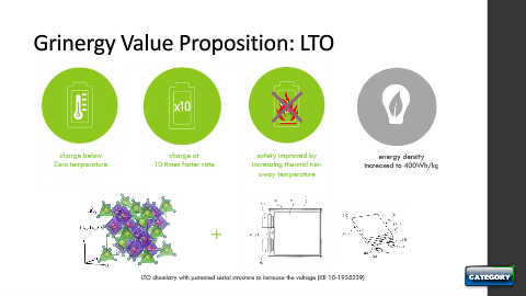 Grinergy Value Proposition: Lithium Metal charge below charge at safety improved by energy density Zero temperature 10 times faster rate increasing thermal run- increased to 400Wh/kg away temperature +
