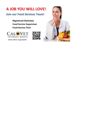 A JOB YOU WILL LOVE! Join our Food Services Team! Registered Dieticians Food Service Supervisor Food Service Tech www.calvet.ca.gov\jobs