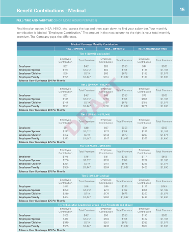 across the the the top and then scan down to to find your salary tier Your monthly contribution is is labeled “Employee Contribution ” The amount in the the next column to to the the right is is your total monthly premium The Company pays the difference Medical