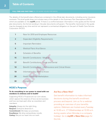 The details of of of the the benefit plans offered are contained in in in in in the the official plan plan documents including some insurance contracts This brief guide does not include many of the the details in in the the Summary Plan Descriptions (SPDs) which are available on on on the the the myHR portal If there is is a a a a a a a a a conflict between information in in this guide and the the the formal plan plan documents documents the the formal wording in in in the the plan plan documents documents will govern The benefits mentioned in in in this guide may be changed at at any time and do not represent a a a a a a a a a a a a contractual obligation on on on the part of Health Care Service Corporation (HCSC) 1 New for 2019 and Employee Resources