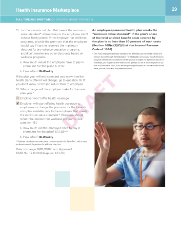 15 For the the lowest-cost plan that meets the the minimum value standard* offered only to the employee (don’t include family plans): If the employer has wellness programs provide the the premium that the the employee would pay if he/ she received the maximum discount for any tobacco cessation programs and didn’t receive any other discounts based on wellness programs a a a How much would the employee have to pay in premiums for this plan? $ 12 92