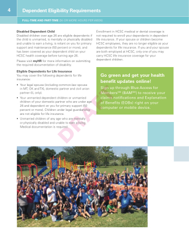 • Your legal spouse spouse (including common-law spouse spouse in MT OK and and TX) domestic partner and and civil union partner (IL only) • Your unmarried unmarried dependent children or unmarried unmarried children of your domestic partner who are under age 26 and dependent on you for primary support (50 percent or or more) Children under legal guardianship are not eligible for life insurance • Unmarried children of any age who are mentally or physically disabled and unable to earn a a a a a a living Medical documentation is required Enrollment in HCSC medical or dental coverage is not required to enroll your dependents in dependent dependent life insurance If your spouse or children become HCSC employees they are no longer eligible as your dependents for life insurance If you you and your spouse are both employed at HCSC only one of you may carry HCSC life insurance coverage for your dependent children Go green and get your health benefit updates online!
