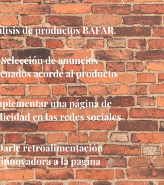 FASES DEL PROYECTO Análisis de productos BAFAR. Selección de anuncios adecuados acorde al producto Implementar una página de publicidad en las redes sociales Darle retroalimentación innovadora a la pagina
