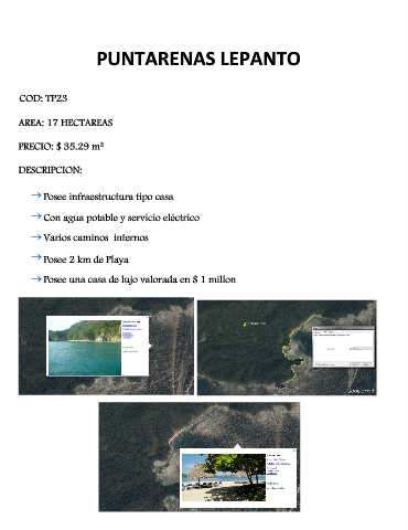 PUNTARENAS LEPANTO COD: TP23 AREA: 17 HECTAREAS PRECIO: $ 35.29 m² DESCRIPCION: → Posee infraestructura tipo casa → Con agua potable y servicio eléctrico → Varios caminos internos → Posee 2 km de Playa → Posee una casa de lujo valorada en $ 1 millon