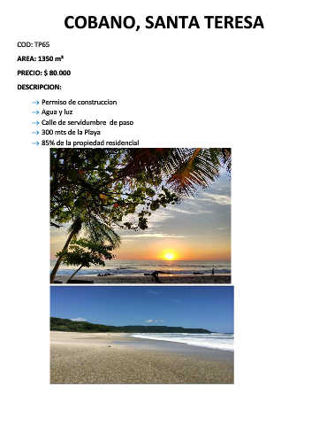 COBANO, SANTA TERESA COD: TP65 AREA: 1350 m² PRECIO: $ 80.000 DESCRIPCION: → Permiso de construccion → Agua y luz → Calle de servidumbre de paso → 300 mts de la Playa → 85% de la propiedad residencial