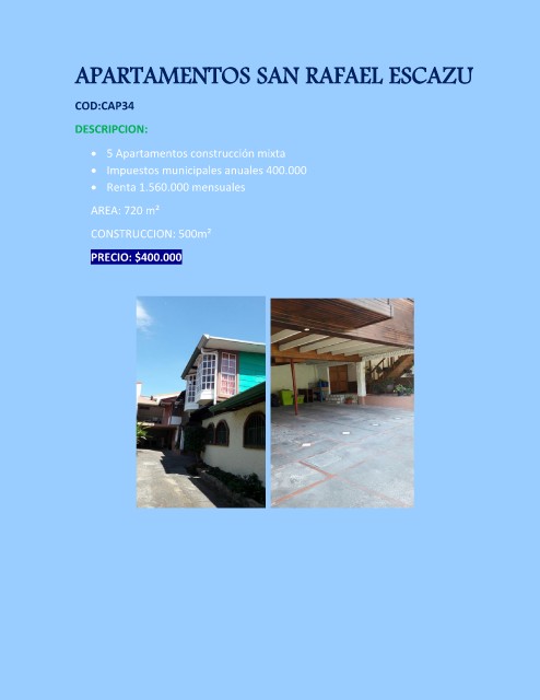 APARTAMENTOS SAN RAFAEL ESCAZU COD:CAP34 DESCRIPCION: • 5 Apartamentos construcción mixta • Impuestos municipales anuales 400.000 • Renta 1.560.000 mensuales AREA: 720 m² CONSTRUCCION: 500m² PRECIO: $400.000