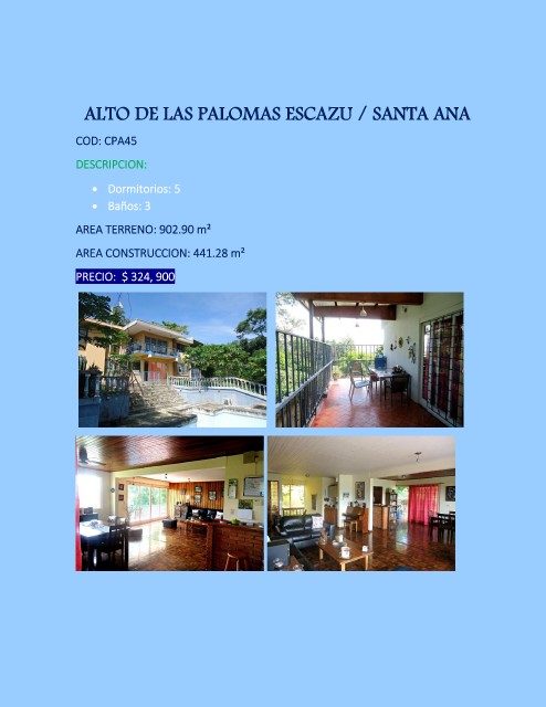 ALTO DE LAS PALOMAS ESCAZU / SANTA ANA COD: CPA45 DESCRIPCION: • Dormitorios: 5 • Baños: 3 AREA TERRENO: 902.90 m² AREA CONSTRUCCION: 441.28 m² PRECIO: $ 324, 900