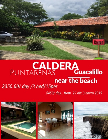 CALDERA Puntarenas Guacalillo near the beach $350.00/ day /3 bed/15per $450/ day.. from 27 dic.3 enero 2019
