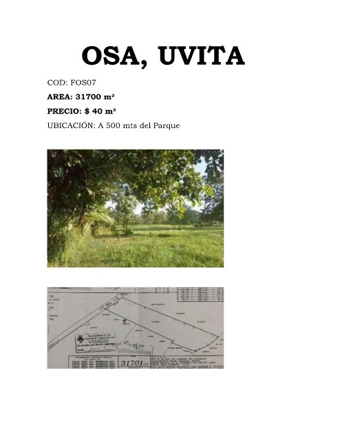 OSA, UVITA COD: FOS07 AREA: 31700 m² PRECIO: $ 40 m² UBICACIÓN: A 500 mts del Parque
