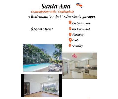 Santa Ana Contemporary style/ Condominio 3 Bedrooms/2.5 bat/ wineries/2 garages Exclusive zone $2900/ Rent not Furnished, Spacious Pool, Security ?