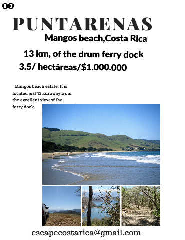 PUNTARENAS Mangos beach,Costa Rica 13 km, of the drum ferry dock 3.5/ hectáreas/$1.000.000 Mangos beach estate. It is located just 13 km away from the excellent view of the ferry dock. escapecostarica@gmail.com