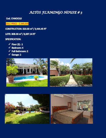 ALTOS FLAMINGO HOUSE # 3 Cod. CVMOO10 SALE PRICE: $ 349,000 CONSTRUCTION: 320.00 m² / 3,444.45 ft² LOTE: 808.00 m² / 8,697.24 ft² SPECIFICATION: Floor (S) : 1 Bedroom: 4 Full Bathroom: 2 Garage: 2