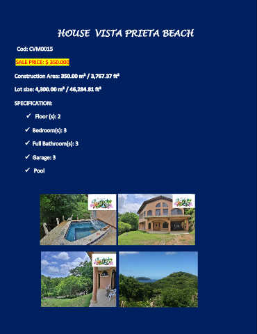 HOUSE VISTA PRIETA BEACH Cod: CVM0015 SALE PRICE: $ 350.000 Construction Area: 350.00 m² / 3,767.37 ft² Lot size: 4,300.00 m² / 46,284.81 ft² SPECIFICATION: Floor (s): 2 Bedroom(s): 3 Full Bathroom(s): 3 Garage: 3 Pool