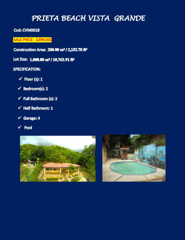 PRIETA BEACH VISTA GRANDE Cod: CVM0018 SALE PRICE: $399.000 Construction Area: 200.00 m² / 2,152.78 ft² Lot Size: 1,000.00 m² / 10,763.91 ft² SPECIFICATION: Floor (s): 1 Bedroom(s): 2 Full Bathroom (s): 2 Half Bathroom: 1 Garage: 4 Pool