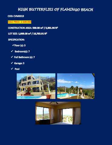 HIGH BUTTERFLIES OF FLAMINGO BEACH COD: CVM0019 SALE PRICE: $ 609.000 CONSTRUCTION AREA: 500.00 m² / 5,381.96 ft² LOT SIZE: 1,000.00 m² / 10,763.91 ft² SPECIFICATION: Floor (s): 3 Bedroom(s): 7 Full Bathroom (s): 7 Garage: 3 Pool