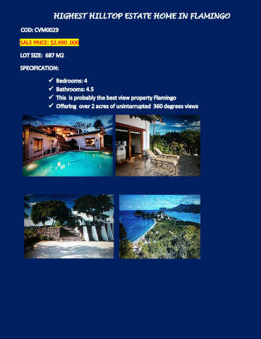 HIGHEST HILLTOP ESTATE HOME IN FLAMINGO COD: CVM0029 SALE PRICE: $2.990 .000 LOT SIZE: 687 M2 SPECIFICATION: Bedrooms: 4 Bathrooms: 4.5 This is probably the best view property Flamingo Offering over 2 acres of uninterrupted 360 degrees views