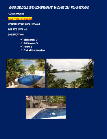 GORGEOUS BEACHFRONT HOME IN FLAMINGO COD: CVM0032 SALE PRICE: $ 5,950.000 CONSTRUCTION AREA: 1094 m2 LOT SIZE: 1579 m2 SPECIFICATION: Bedrooms : 7 Bathrooms : 9 Floors: 3 Pool with ocean view