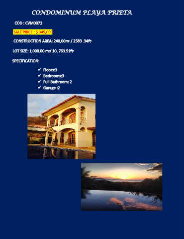 CONDOMINUM PLAYA PRIETA COD : CVM0071 SALE PRICE : $ 349,000 CONSTRUCTION AREA: 240,00m² / 2583 .34ft² LOT SIZE: 1,000.00 m²/ 10 ,763.91ft² SPECIFICATION: Floors:3 Bedrooms:3 Full Bathroom: 2 Garage :2