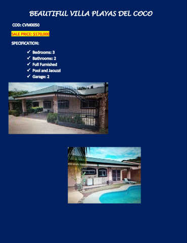 BEAUTIFUL VILLA PLAYAS DEL COCO COD: CVM0050 SALE PRICE: $170,000 SPECIFICATION: Bedrooms: 3 Bathrooms: 2 Full Furnished Pool and Jacuzzi Garage: 2