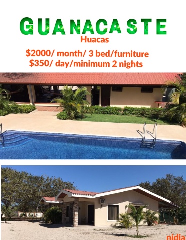 Huacas $2000/ month/ 3 bed/furniture $350/ day/minimum 2 nights nidia