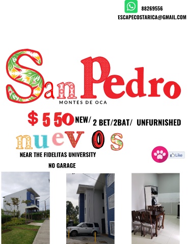 88269556 ESCAPECOSTARICA@GMAIL.COM M O N T E S D E O C A NEW/ 2 BET/2BAT/ UNFURNISHED NEAR THE FIDELITAS UNIVERSITY NO GARAGE
