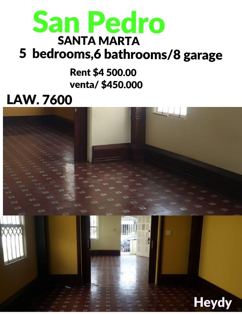 San Pedro SANTA MARTA 5 bedrooms,6 bathrooms/8 garage Rent $4 500.00 venta/ $450.000 LAW. 7600 Heydy