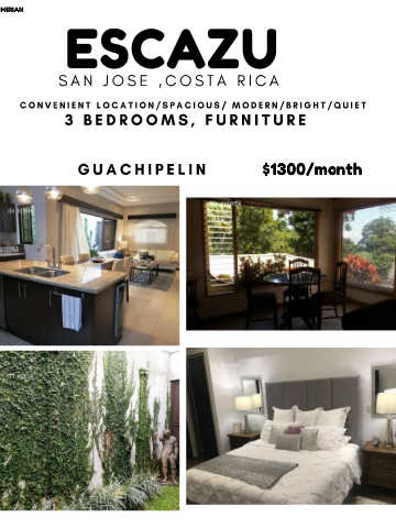 MIRIAN ESCAZU S A N J O S E , C O S T A R I C A C O N V E N I E N T L O C A T I O N / S P A C I O U S / M O D E R N / B R I G H T / Q U I E T 3 B E D R O O M S , F U R N I T U R E $1300/month G U A C H I P E L I N