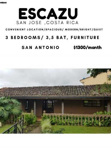 MIRIAN ESCAZU S A N J O S E , C O S T A R I C A C O N V E N I E N T L O C A T I O N / S P A C I O U S / M O D E R N / B R I G H T / Q U I E T 3 B E D R O O M S / 3 , 5 B A T , F U R N I T U R E $1300/month S A N A N T O N I O