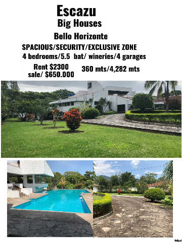 Escazu Big Houses Bello Horizonte SPACIOUS/SECURITY/EXCLUSIVE ZONE 4 bedrooms/5.5 bat/ wineries/4 garages Rent $2300 360 mts/4,282 mts 50.000 sale/ $6 felipe L