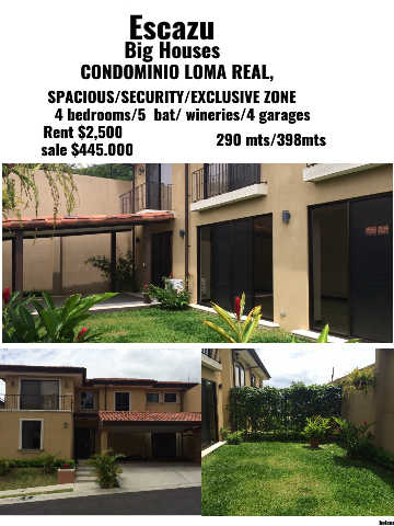 Escazu Big Houses CONDOMINIO LOMA REAL, SPACIOUS/SECURITY/EXCLUSIVE ZONE 4 bedrooms/5 bat/ wineries/4 garages Rent $2,500 290 mts/398mts sale $4 45.000 helcor