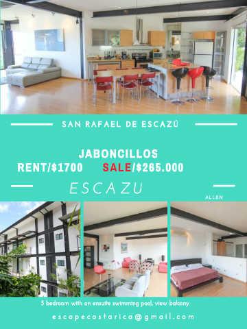 S A N R A F A E L D E E S C A Z Ú JABONCILLOS RENT/$1700 SALE/$265.000 E S C A Z U A L L E N 3 bedroom with an ensuite swimming pool, view balcony. e s c a p e c o s t a r i c a @ g m a i l . c o m