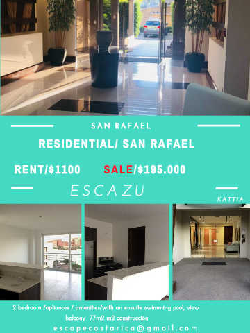 S A N R A F A E L RESIDENTIAL/ SAN RAFAEL RENT/$1100 SALE/$195.000 E S C A Z U K A T T I A 2 bedroom /apliances / amenities/with an ensuite swimming pool, view balcony.. 77m2 m2 construcción e s c a p e c o s t a r i c a @ g m a i l . c o m