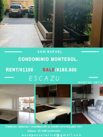 S A N R A F A E L CONDOMINIO MONTESOL. RENT/$1100 SALE/$165.000 E S C A Z U M A R I T Z A O R T I Z 2 bedroom /apliances / amenities/with an ensuite swimming pool, view balcony.. 65 mts2 construcción e s c a p e c o s t a r i c a @ g m a i l . c o m