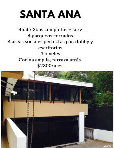 SANTA ANA 4hab/ 3bñs completos + serv 4 parqueos cerrados 4 areas sociales perfectas para lobby y escritorios 3 niveles Cocina amplia, terraza atrás $2300/mes ALICE