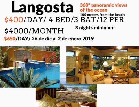 Langosta 360º panoramic views of the ocean 100 meters from the beach $400/DAY/ 4 BED/3 BAT/12 PER $4000/MONTH 3 nights minimum $650/DAY/ 26 de dic al 2 de enero 2019
