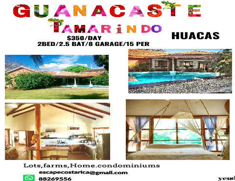 HUACAS $350/DAY 2BED/2.5 BAT/8 GARAGE/15 PER Lots,farms,Home.condominiums escapecostarica@gmail.com 88269556 yeud